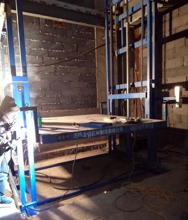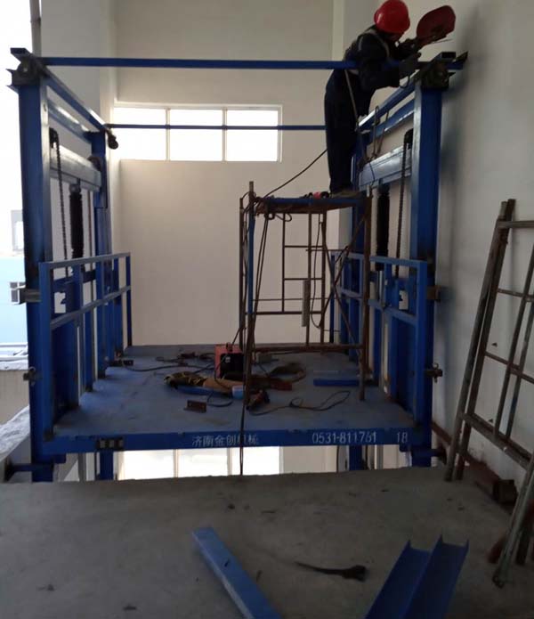 液壓升降貨梯生產制造廠家-濟南金創機械制造有限公司,為威海客戶定做的升高13米,載重5噸的導軌鏈條式液壓升降貨梯,嚴寒天氣下,經過安裝師傅加班加點的努力,昨天下午通過了客戶方的驗收工作。